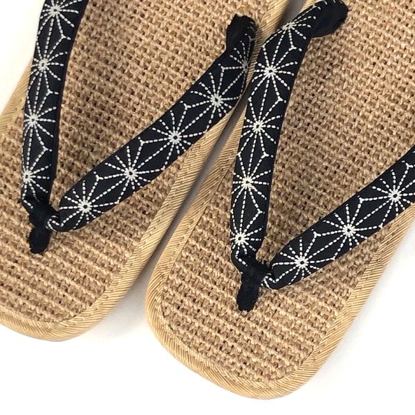 麻のナチュラルな風合いと和柄の小紋の鼻緒は、和装に限らずジーンズやカジュアルのスタイルにもよく調和してくれます。