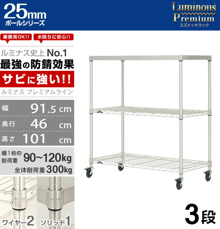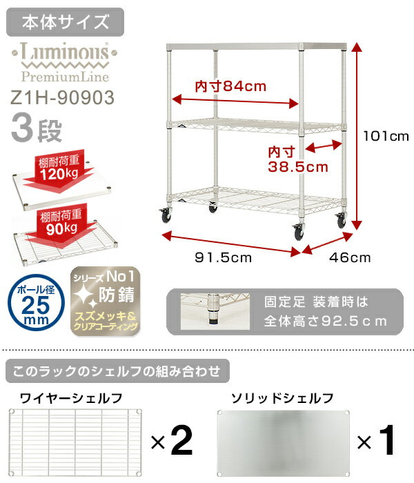 【プラチナシルバー】 スチールラック 業務用 防錆 スチール棚 ルミナス プレミアムライン 純正品 <ソリッドシェルフ付> 幅90 奥行45モデル スチール メタル ラック 棚 3段 クリアキャスター付 天板付 収納棚 z1h-90903